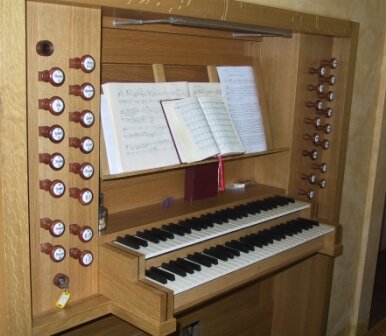 Principal Holzflöte* Gamba Gedeckt Oktav Flöte Quinte Superoctave Mixtur 4f. Trompete * aus der Vorgängerorgel Koppeln: II/I; I/P; II/P |